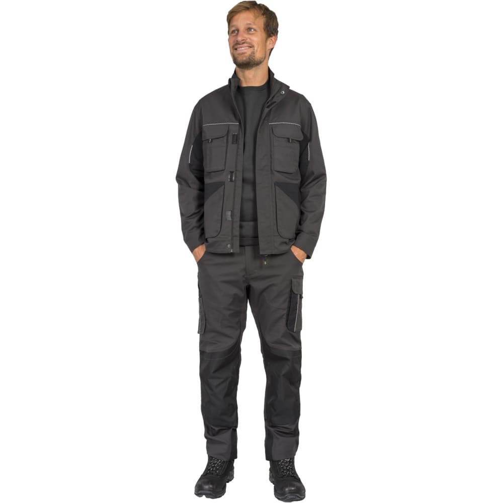 Džepovi: dva džepa za ruke s po dva mala džepa, dva stražnja džepa s ukrasnim šavovima, džep za ravnalo s dva držača za olovke na desnoj nozi, džep za teret na lijevoj nozi, džepovi za štitnike za koljena izrađeni od 600D/PU Oxford materijala za odvojene štitnike za koljena.
